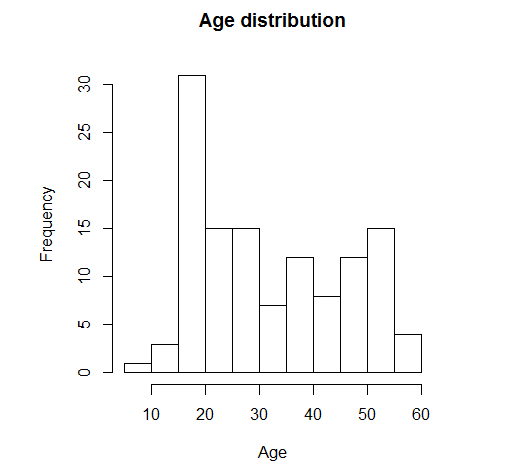 > hist(ALL$age,xlab="Age",main="Age distribution")