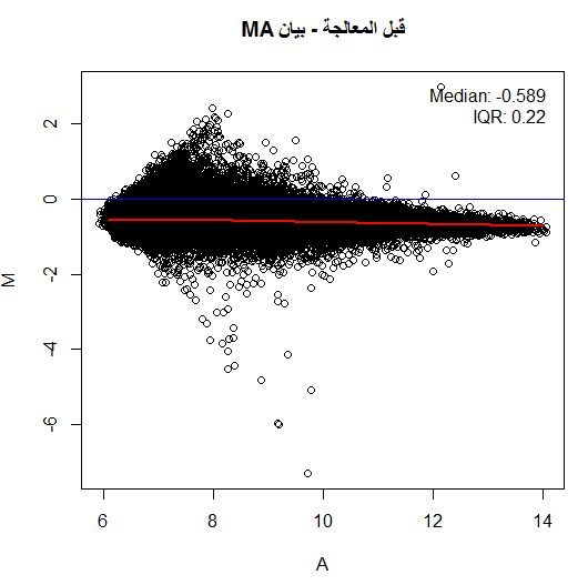 لكن في أغلب الأحيان لا نلاحظ هذا التوزيع حيث تكون النقاط على شكل فاكهة الموز (Banana Shape) وهذا يعني أنه يجب علينا تصحيحها. من الطرق المستعملة جدا هي رؤية البيانات بإستعمال طريقة MA plot, حيث نسبة الإشعاع الاحمر والأخضر $M$ لكل جين مع متوسط التغير بين الإشعاعين $A$. في الحقيقة لا يمثل هذا البيان إلا إدارة بنسبة 45 درجة للبيان الذي يقارن اللونين الأحمر والأخضر. يتم حساب قيمة M و A كالتالي:
