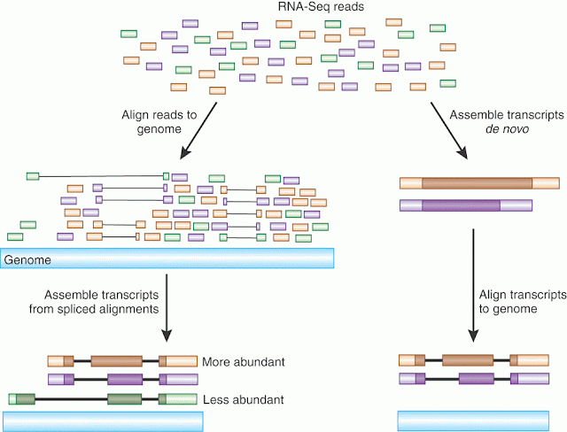 في حالة عدم معرفة صيغة الجينوم الأصلي نقوم بعملية التجميع من البداية(de-novo Assembly) حيث يتم تجميع السلاسل التي تحتوي على أجزاء متشابهة معا للحصول على صيغة الجينوم الأصلي مثل لعبة تجميع الصور المقطعة.