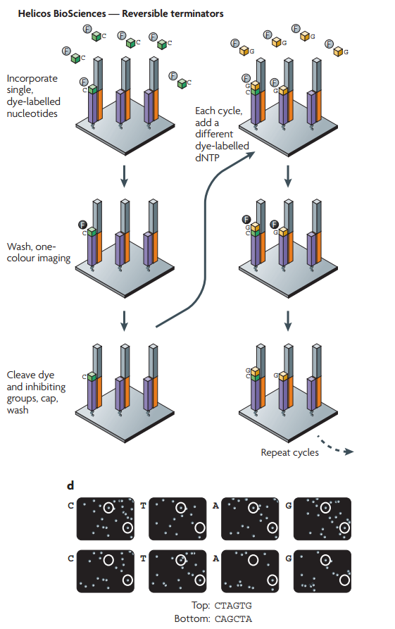 ج- آلات Helicos: تقوم آلآت Helicos على نفس مبدأ عمل آلآت Illumina إلا أن تستعمل لونا واحدا ويتم إظافة جزيئ قاعدي فقط في كل مرة عكس Illumia التي تضيف كل الجزيئات القاعدية لكن كل واحد بلون خاص, يمكن تلخيص التقنية في الرسم البياني التالي:
