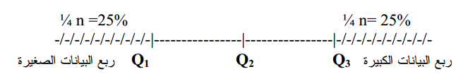 الهدف من هذا المقياس هو محاولة حساب مدى توزع البيانات بدون التأثر بالقيم الشاذة وذالك عن طريق اهمال القيم التي تتكون أقل من 25% من قيم البيانات (الربيع الأول Q_1) والقيم التي تتجاوز 75% من القيم (الربيع الثالث Q_3). إذن IQR = Q_3 - Q1