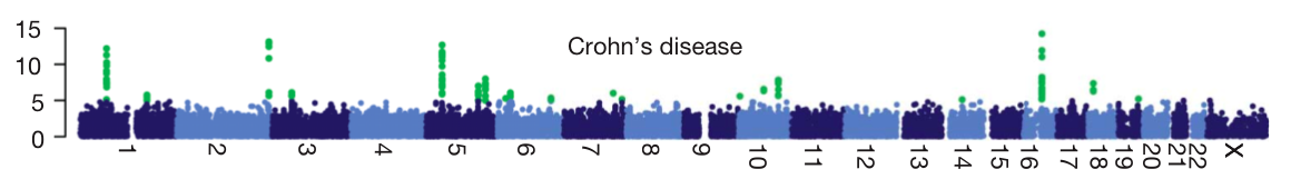 في مجال المعلوماتية الحيوية يمكن استعمال مخططات أخرى مثل مخطط مانهاتن (Manhattan Plot) التي تستعمل في دراسات الارتباطات الجينومية (GWAS) لدراسة علاقة الطفرات بالأمراض أو التغيرات النمطية بصفة عامة. حيث تُمَثَل الطفرات على المحور الأفقي ويُمَثَل احتمال وجود الارتباط على المحور العموي. تَمثِل القيم الكبرى الطفرات المسؤولة (ملونة بالأخضر في البيان).